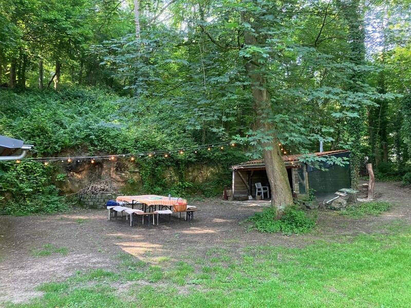 Donderdagochtend moesten we om iets voor 10 uur verzamelen onderaan de Bemelerberg. We werden daar opgehaald door Birgit Spoorenberg, een leuke enthousiaste vrouw en met haar jurkje, blote benen en hoedje op een aangename verschijning. We werden door een poort via een tuin naar een geweldige plek begeleidt. Midden in de natuur onder aan het bos stond een overdekte buitenkeuken, een tafel met bankjes een overkapping met houtkachel en een apart wc gebouwtje.